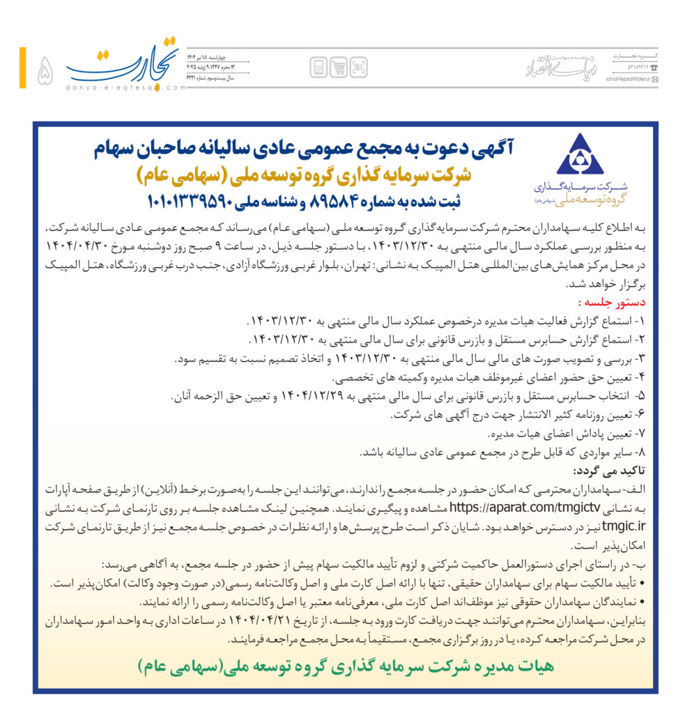 شرکت سرمایهگذاری گروه توسعه ملی (سهامی عام) با شماره ثبت ۸۹۵۸۴ و شناسه ملی ۱۰۱۰۱۳۳۹۵۹۰ به اطلاع کلیه سهامداران محترم میرساند که مجمع عمومی عادی سالیانه شرکت، به منظور بررسی عملکرد سال مالی منتهی به ۱۴۰۳/۱۲/۳۰، در ساعت ۹ صبح روز دوشنبه مورخ ۱۴۰۴/۰۴/۳۰ در محل مرکز همایشهای بینالمللی هتل المپیک به نشانی تهران، بلوار غربی ورزشگاه آزادی، جنب درب غربی ورزشگاه، هتل المپیک برگزار خواهد شد.